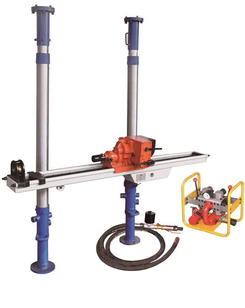 一般礦井在掘進前都要進行超前探放水,利用氣動架柱鉆機等探水設(shè)備打幾十米甚至一百米的探水孔,根據(jù)鉆頭的推進速度、巖屑成分等地質(zhì)資料,初步斷定巷道周圍的水質(zhì)水量,因此氣動架柱鉆機是預防突水、涌水等災害的發(fā)生主要工具。